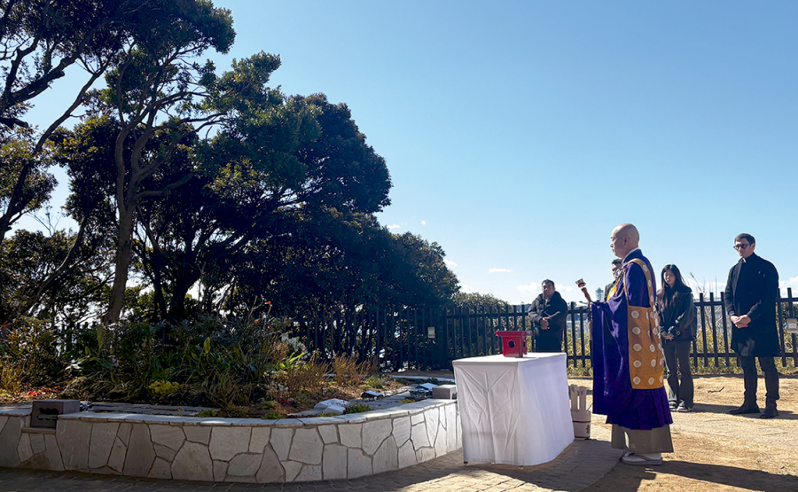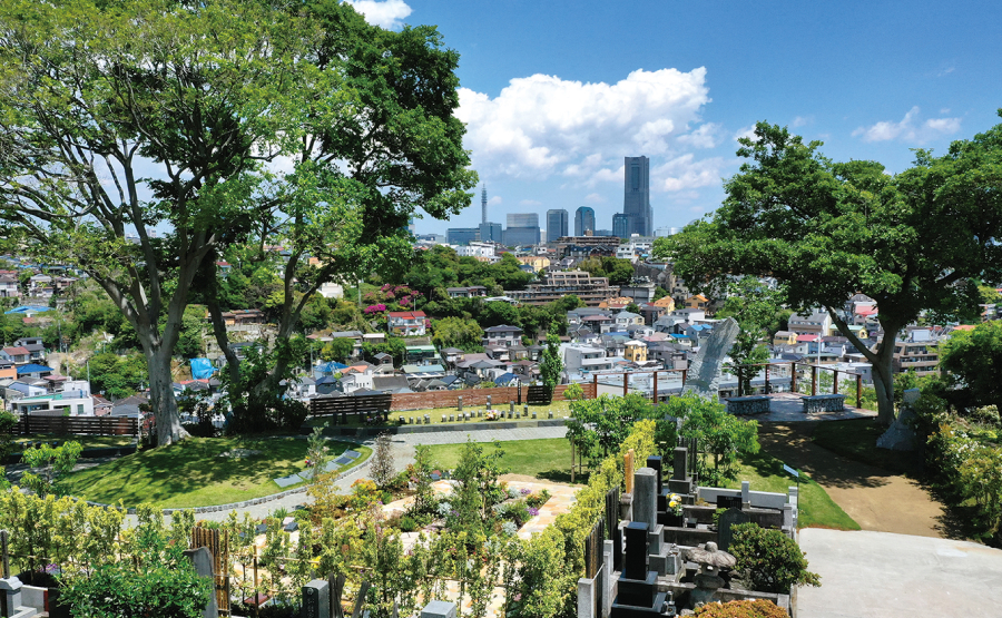 高台に位置した、都市のランドマークを一望できる抜群のロケーション。周囲の豊かな緑と一体化するようにデザインされた、景観に溶け込む墓所です。